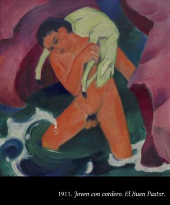 1911. Joven con cordero. El Buen Pastor. En 1911, Marc es uno de los fundadores (junto con Kandinsky) de El Jinete Azul, uno de los más importantes grupos del expresionismo alemán. El expresionismo de este grupo es más simbólico y “poético” que el de otros expresionistas (cuya obra es más “agresiva”), y va camino a la abstracción total (como podemos observar en la últimas obras de esta galería).