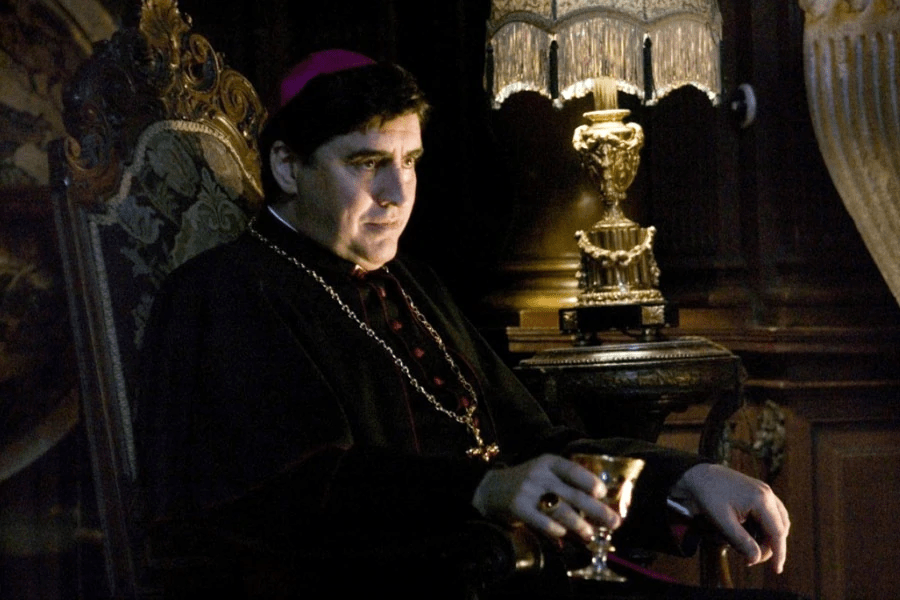 Imagen: Alfred Molina interpreta al obispo Manuel Aringarosa (arenque rosado) en el film The Da Vinci Code (El código Da Vinci, Ron Howard, 2006), basado en el libro de Dan Brown.