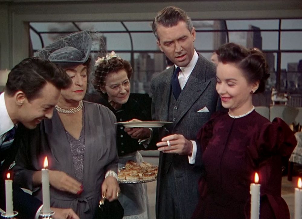 Imagen: James Stewart en La soga (Alfred Hitchcock, 1948). Una velada con un cadáver oculto en el arcón que sirve de mesa para la cena. Si fuera una película de misterio, se trataría de deducir quién ha sido el asesino. Como es una película magistral de suspense, los espectadores sabemos durante todo el film quiénes son los asesinos y que el cadaver está ahí. El suspense se genera en la ansiedad de saber si el profesor favorito de los asesinos podrá descubrir que hubo un asesinato.