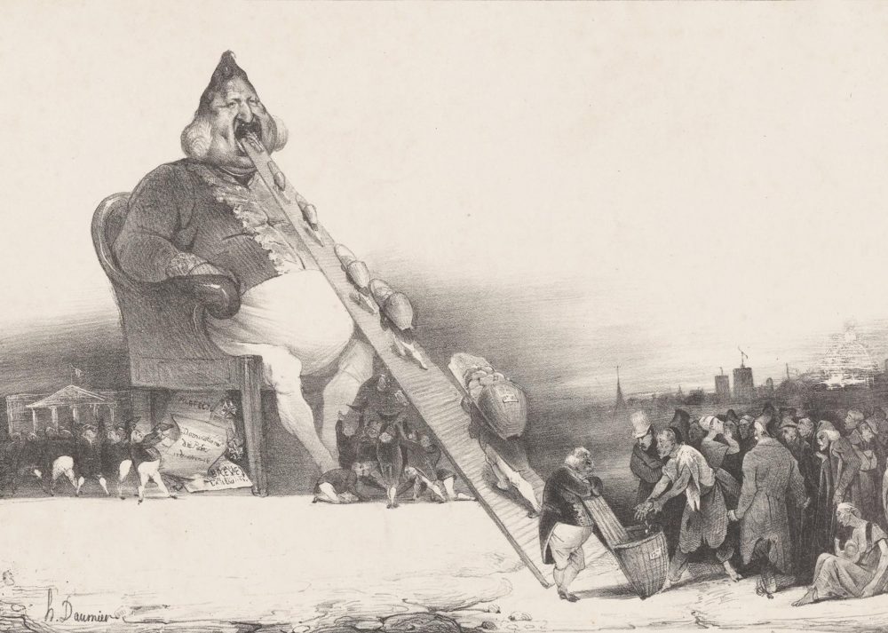 Esta litografía, de 1831, si bien muestra al gigante Gargantúa, está parodiando en realidad al rey Luis Felipe de Orleans, opulento y ávido de lujo, que devora insaciable los impuestos de su pueblo hambreado.