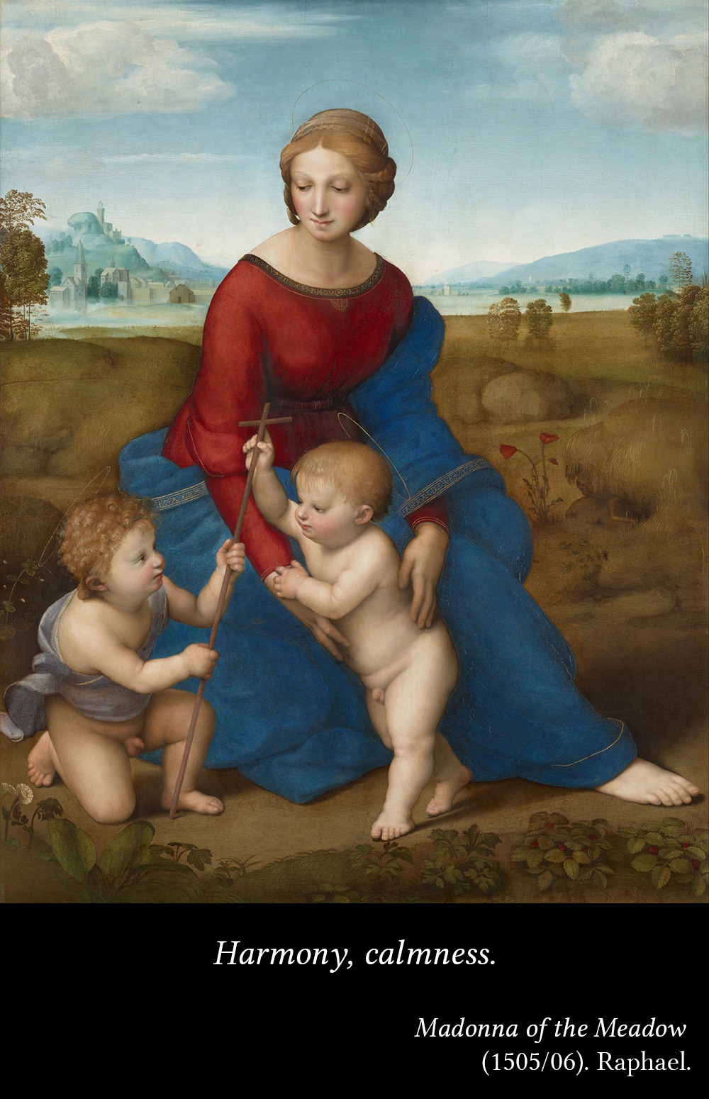Harmony, calmness. In general, scenes transmit serenity; the bodies are at rest. (The opposite takes place in the Baroque.)
