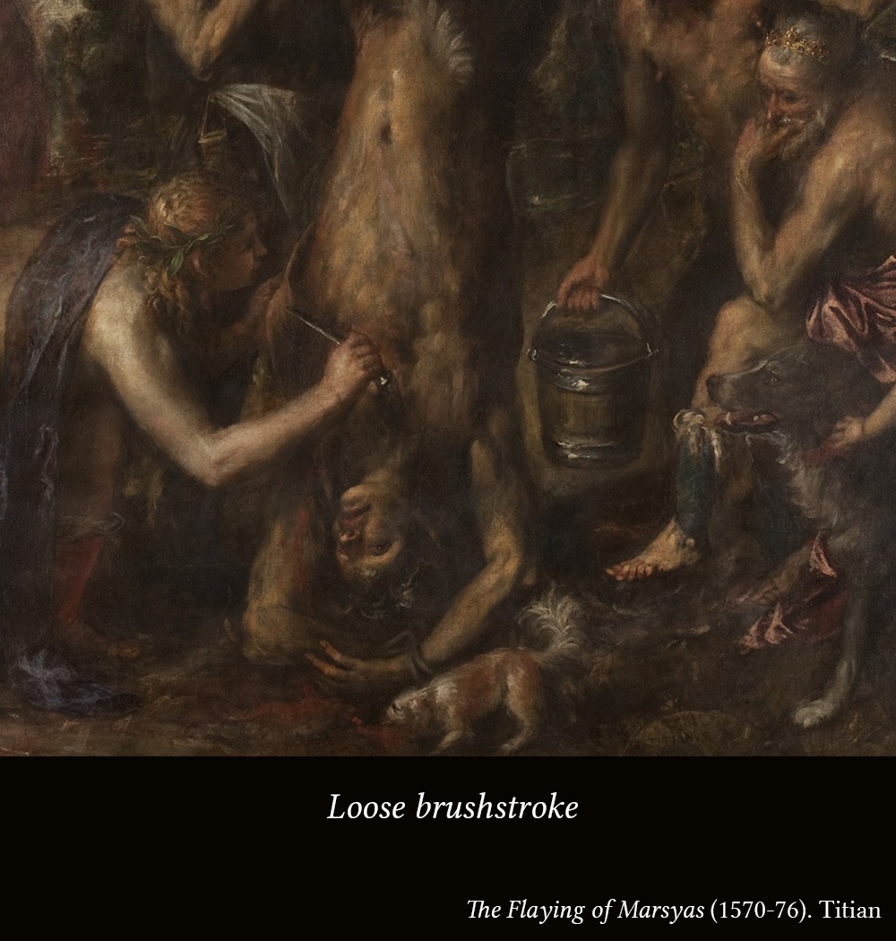 Loose brushstroke. In this period, the loose brushstroke was born in Venice (it is attributed to Titian), which would become so important in the history of art. For this reason, the loose brushstroke is sometimes called "Venetian brushstroke."
