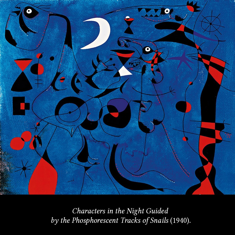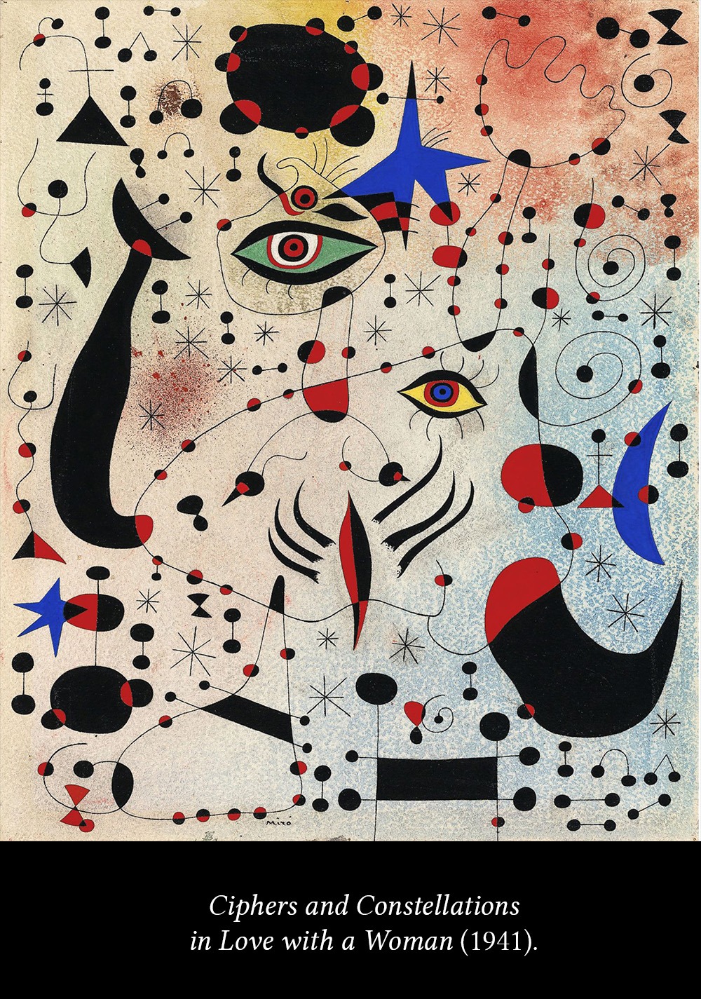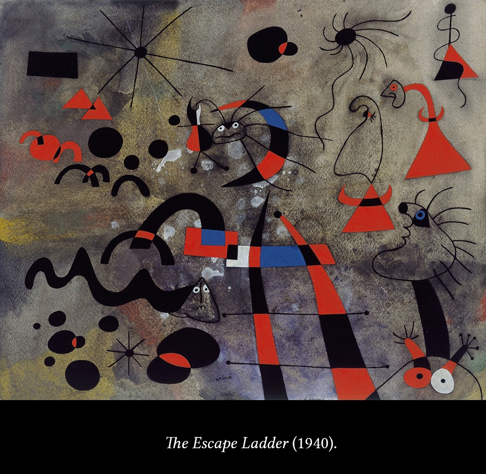 It is a series of 23 small works on paper, with signs representing stars, birds and women forming a cosmos, a celestial map. A heaven reached by a stair sometimes. Stairs to escape: Miró feels the need to escape from the horrible reality that the World War II means. He escapes into the universe that he creates.