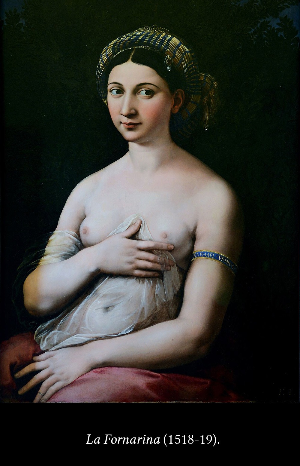Margherita Luti was the daughter of a baker, and she was called La Fornarina (the Little Baker). She was Raphael’s great love and lived with him, although they did not get married because he was engaged to the niece of the cardinal Dovizi (trusted man of the Medici family). Nevertheless, when a cleaning of her portrait was done, (the first we place in this series), it was discovered that she had a wedding ring in her finger which might be a symbol or they might have got married in secret.