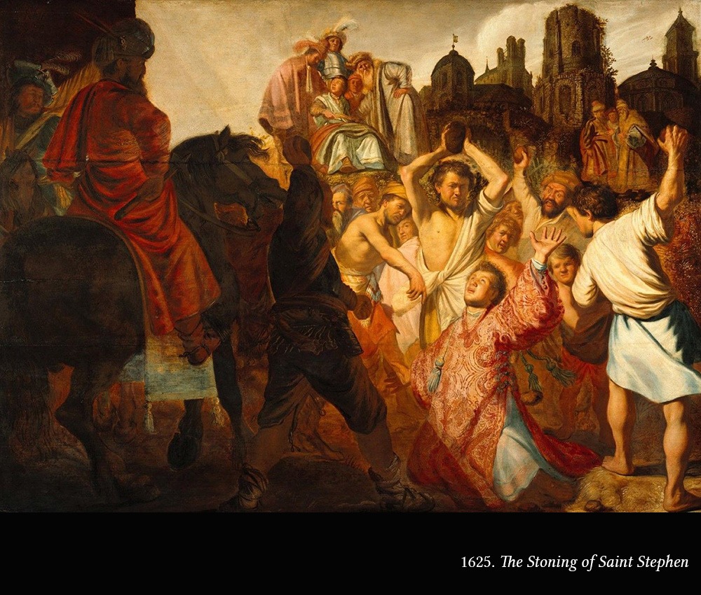 1625. The Stoning of Saint Stephen. When he was 18-19 years old, (1624–1625) Rembrandt opened his own studio in Leiden. His work is rich in detail, his brushstroke is careful, meticulous. His palette is colorful, brilliant.