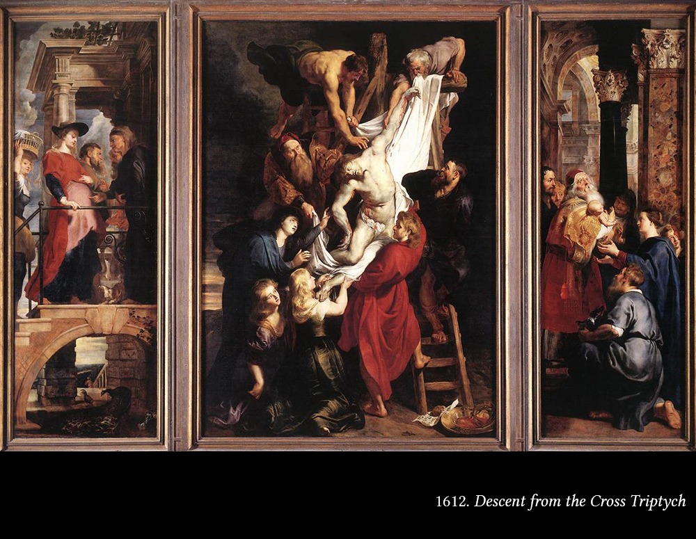 In 1598, when he was 21 years old, he became a master of the guild (an association, in this case of painters) of St. Luke of Antwerp. He then travelled to Italy for 2 years to study the painters of the Renaissance. In Venice, he became acquainted with the work of Titian, whom he would consider his true master for the rest of his life. We see Titian's influence in color, movement, and the loose brushstroke.
