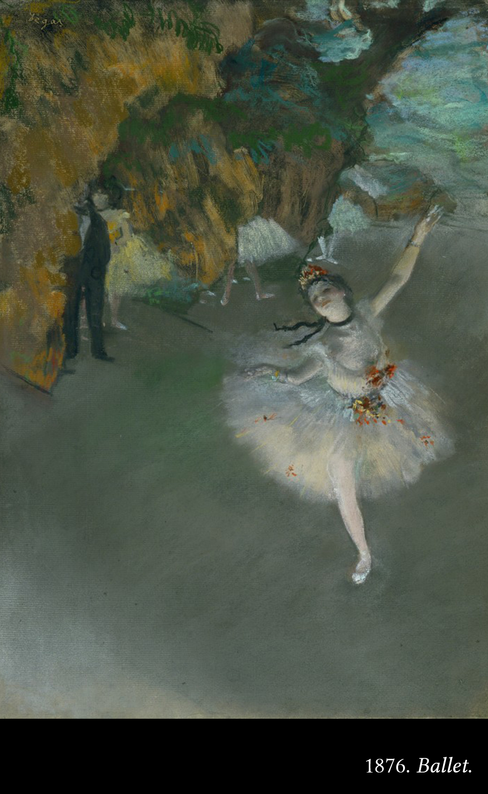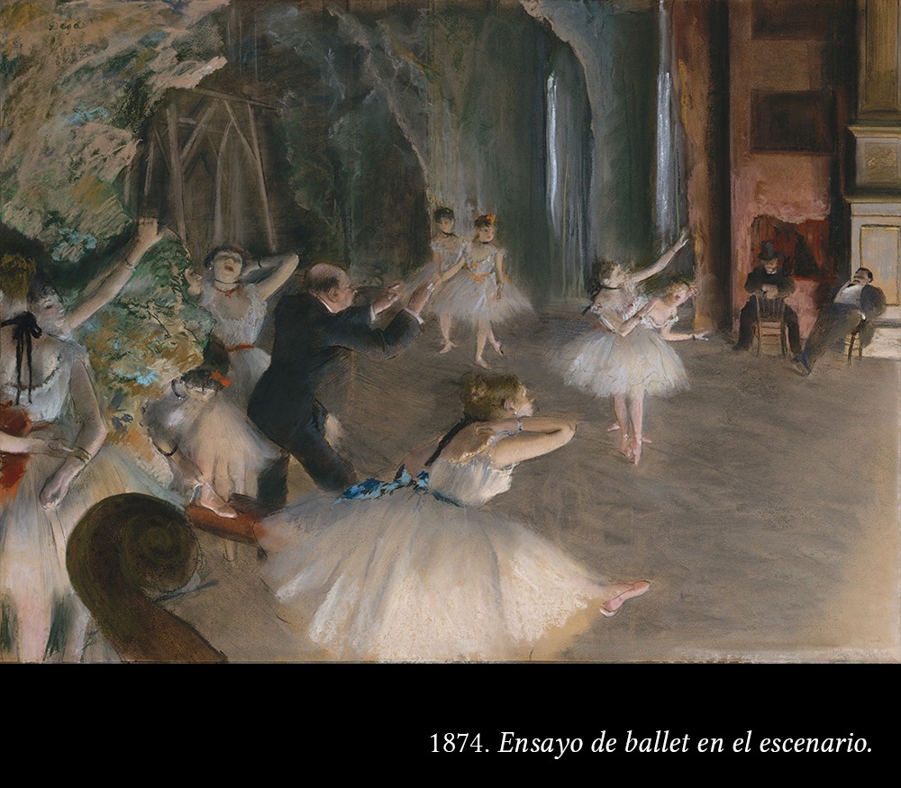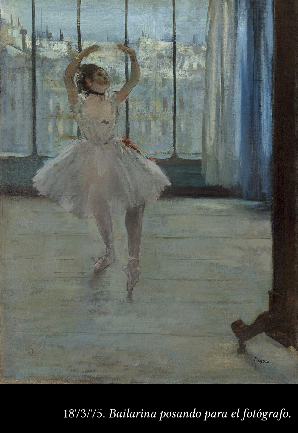 1873/75. Bailarina posando para el fotógrafo. A partir de 1873, se une al grupo de jóvenes que luego se llamarán “impresionistas”. Si bien se convierte en una figura preponderante del grupo, él no pinta con el estilo impresionista ni le gusta que lo tilden de impresionista.