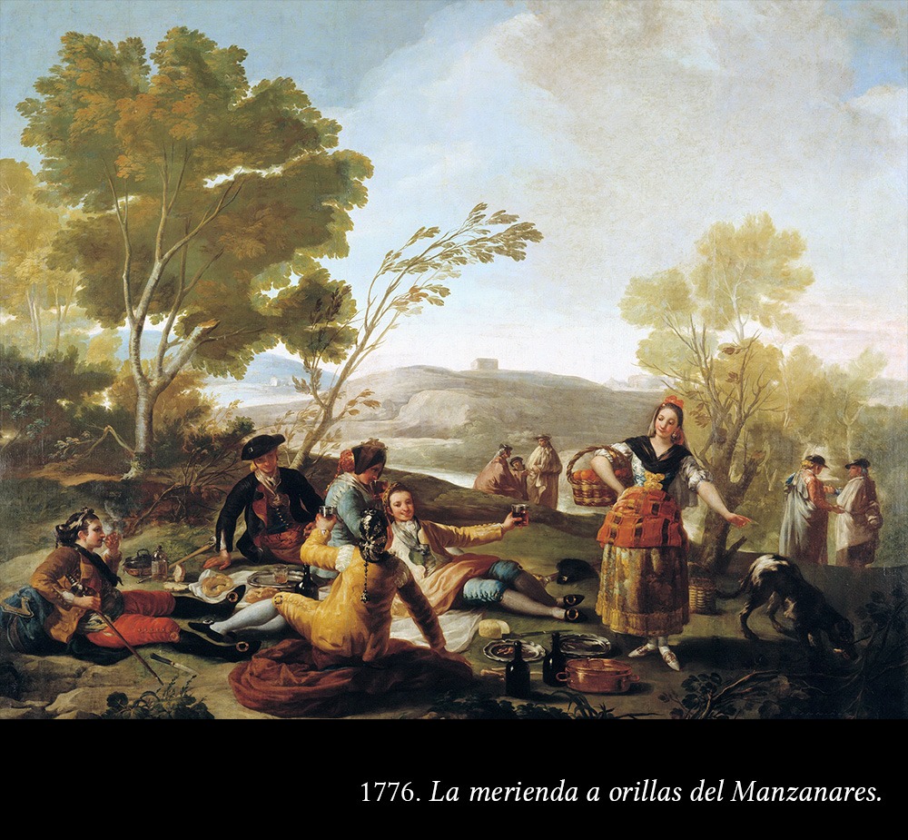 1776. La merienda a orillas del Manzanares. En esta etapa, Goya trabaja diseñando cartones para la Real Fábrica de Tapices de Madrid. Podemos decir que su estilo y la temática de su obra todavía “pertenecen” al rococó.