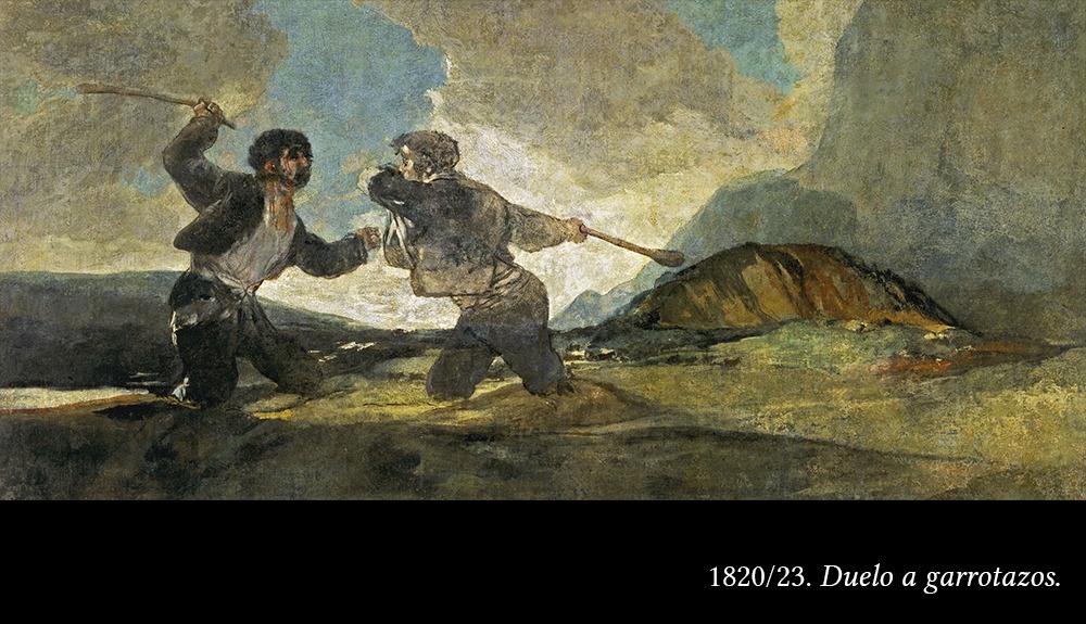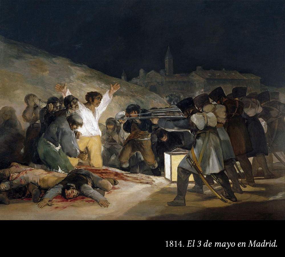 1814. El 2 de mayo de 1808 en Madrid. Los eventos de la guerra de independencia lo llevan a expresar la angustia y el horror. Empieza a utilizar la distorsión y la exageración de los rasgos como recurso para “expresar”.