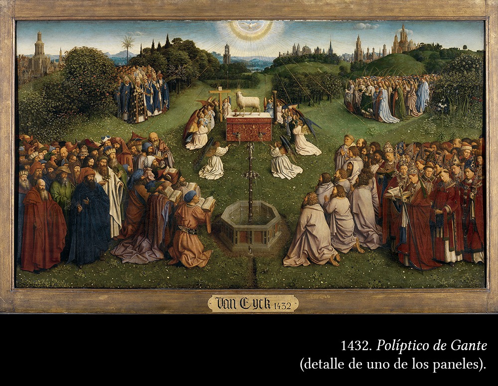 1432. Políptico de Gante. Esta obra fue comenzada por su hermano Hubert. Al morir éste, Jan la continúa y finaliza en 1432.