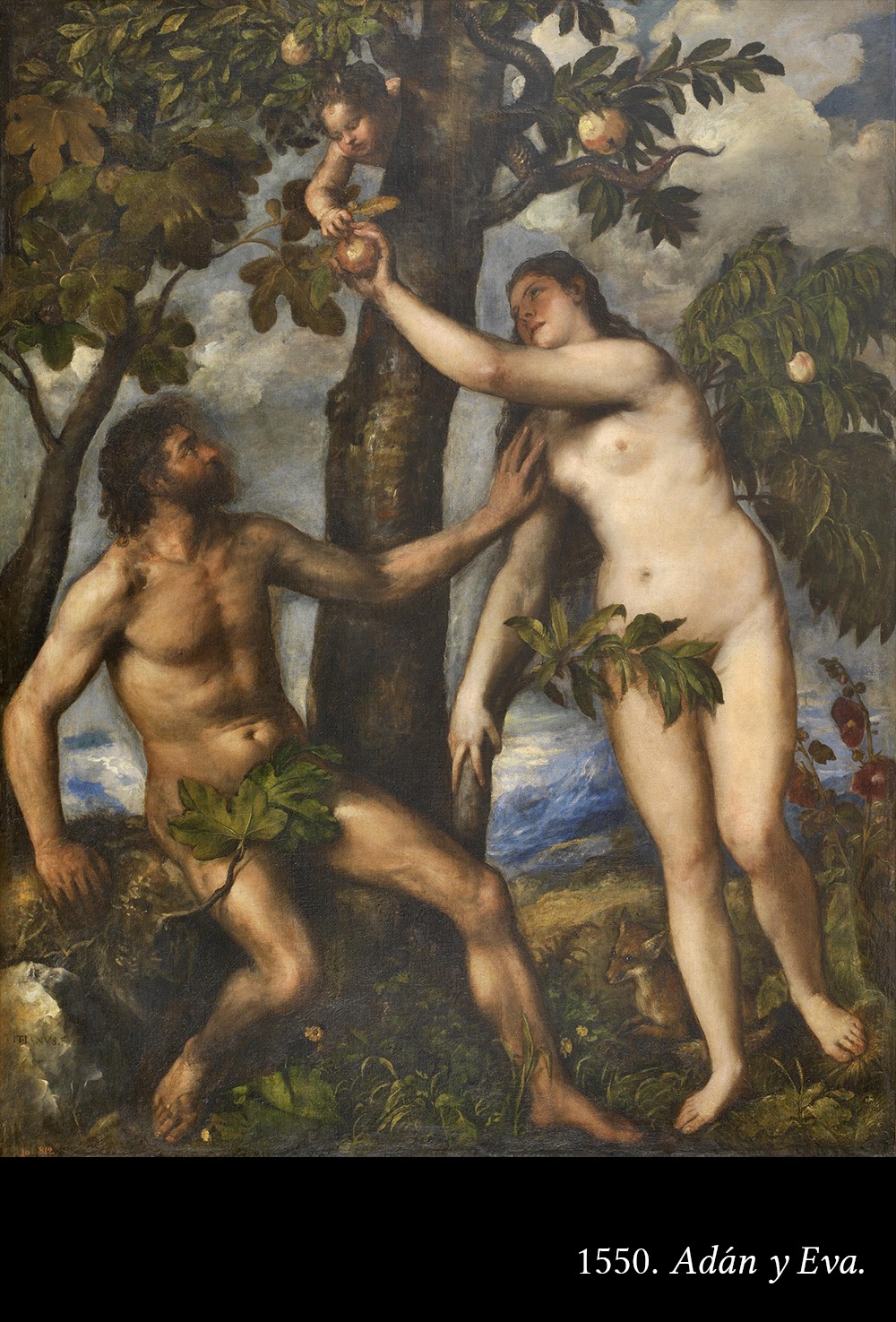 1550. Adán y Eva. En la madurez de su carrera, se impone en la obra de Tiziano la pincelada suelta, el “predominio del color sobre la línea”.