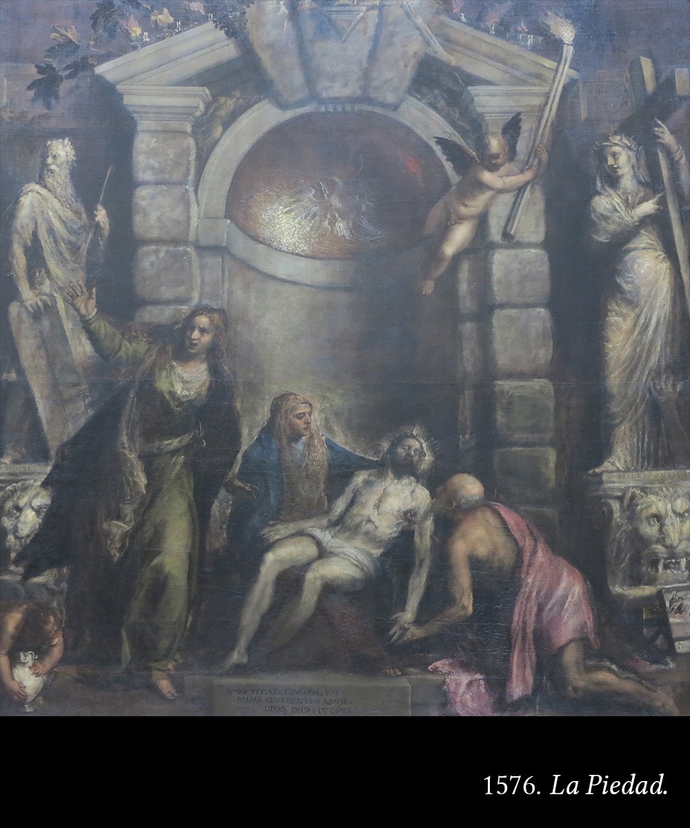 1576. La Piedad. Esta obra tiene como destino la tumba del propio artista. La muerte lo sorprende antes de terminarla, y entonces la terminará Palma el Joven.
