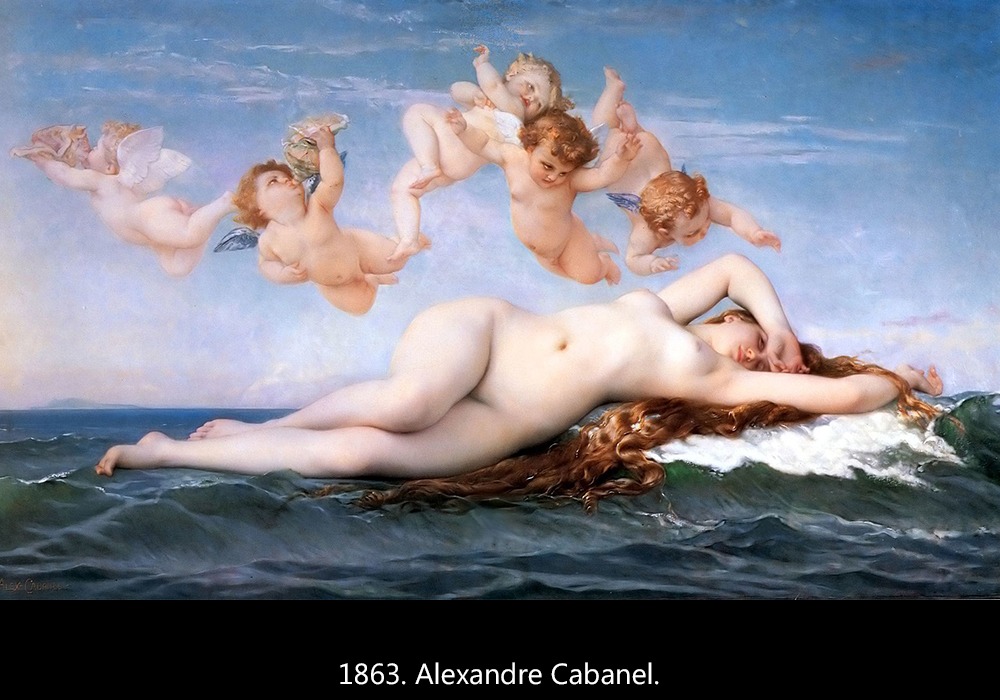 Afrodita la llaman los griegos, y su nombre quiere decir "la que nace de la espuma". Venus la llaman los romanos, y a la imagen de la diosa que nace ya adulta emergiendo del mar le dicen "Venus Anadiomena". Ella es la diosa del amor, la belleza, la lujuria, la sexualidad. Y entonces no es extraño que esta escena sea una de las más elegidas por los pintores de todos los tiempos: permite representar (y como si fuera poco, desnuda) la imagen más perfecta y bella (algunos la eligen pura, otros más erótica y provocativa) que el artista pueda imaginar.