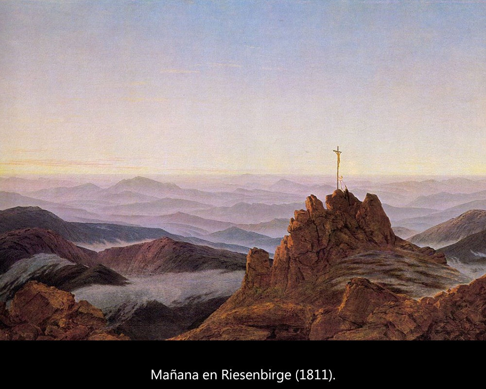 Friedrich es uno de los pintores más importantes del romanticismo alemán. Sin embargo, no idealiza los paisajes como haría un romántico, sino que los convierte en símbolos poderosos. Son paisajes psicológicos, inquietantes, meláncólicos, que transmiten la pequeñez y la soledad del hombre, ya no todopoderoso sino apenas un espectador ante el maravilloso espectáculo de la creación divina (observemos que los personajes están de espaldas, contemplando).