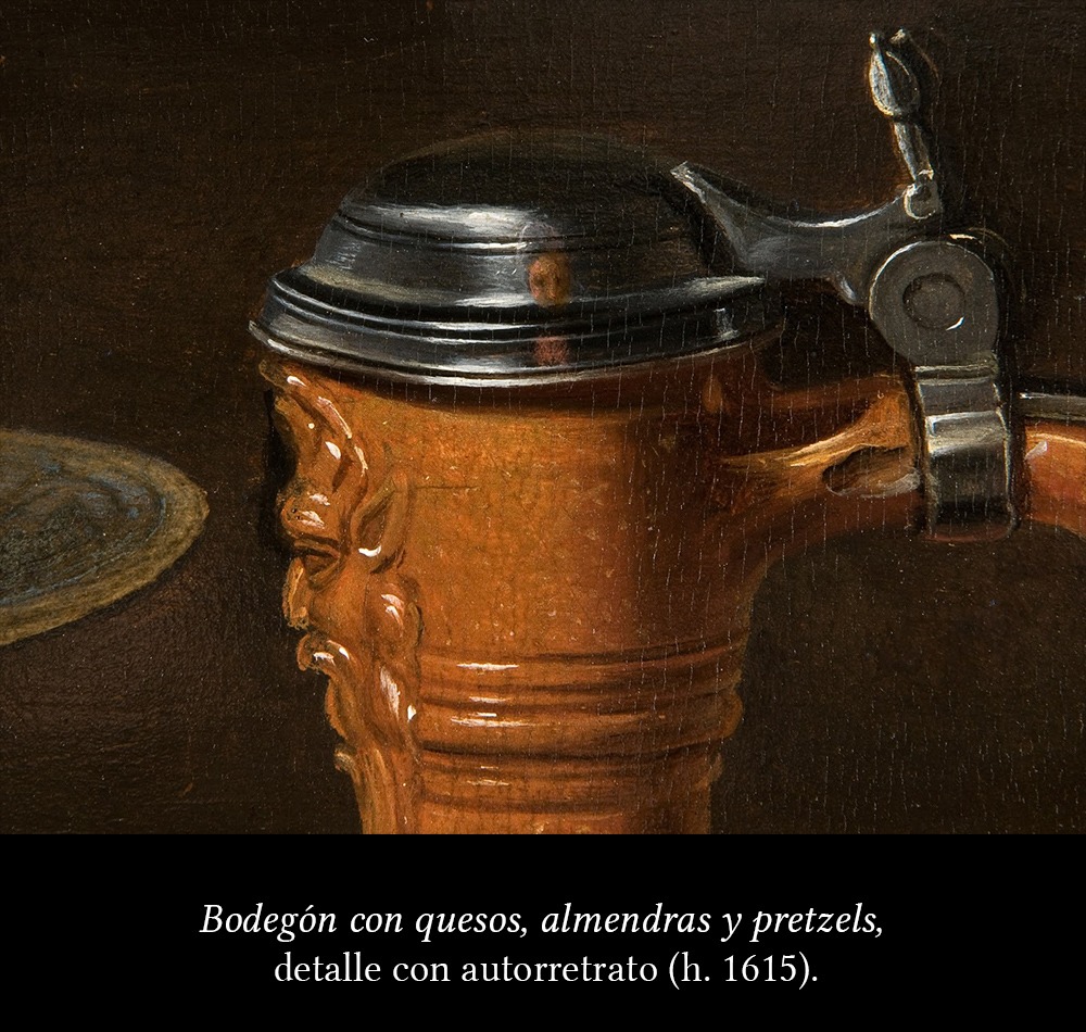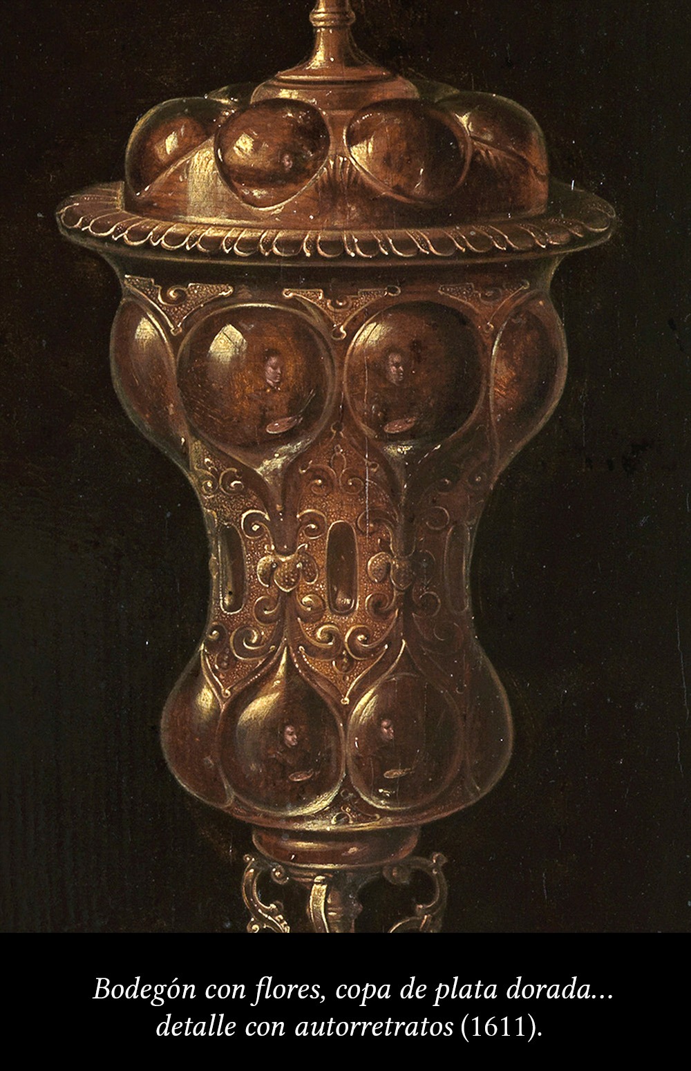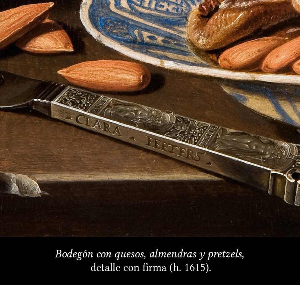 Clara Peeters “esconde” en algunos de sus cuadros detalles casi imperceptibles como su nombre grabado en un cuchillo, o autorretratos en miniatura en los reflejos de copas o jarras.