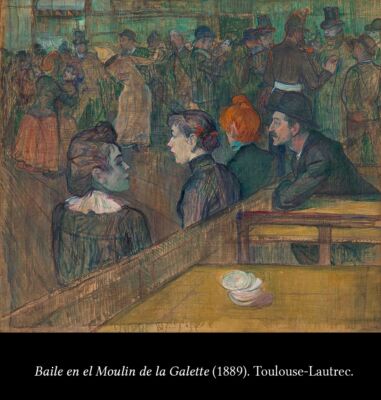 El Moulin de la Galette (nombre que se impone popularmente), luego camba el vaso de leche por uno de vino y, sobre el final del siglo, se convierte en uno de los lugares de encuentro y de baile más emblemáticos de la Butte (que quiere decir “loma” y es como se le llama cariñosamente al barrio de Montmartre, que está sobre una loma).