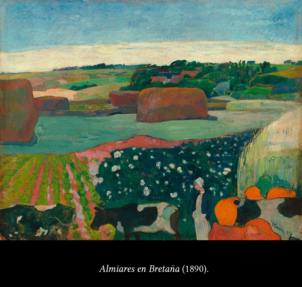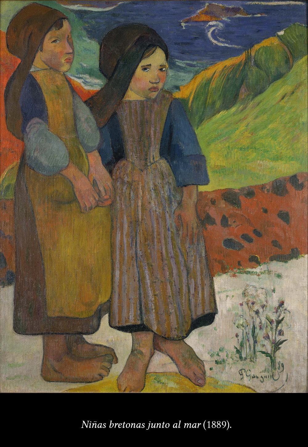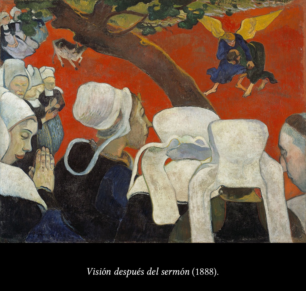 Gauguin necesita escapar del mundo artificial de la gran ciudad en busca de la pureza. Y, motivado por un libro de Flaubert y Du Camp, Un viaje por Bretaña, que habla de un pueblo que vive libre como en el origen de la humanidad, parte hacia ese lugar (años más tarde irá a lugares aún más “puros” todavía: Martinica y Tahití). Allí encuentra un mundo rústico, “primitivo”, sumamente espiritual, cuya libertad lo inspira también a liberarse de las ataduras en su arte. Es en Pont-Aven específicamente donde termina de cortar lazos con el impresionismo y se vuelve el Gauguin que conocemos, el “postimpresionista”, que será una gran infuencia para pintores y movimientos enteros de la modernidad.