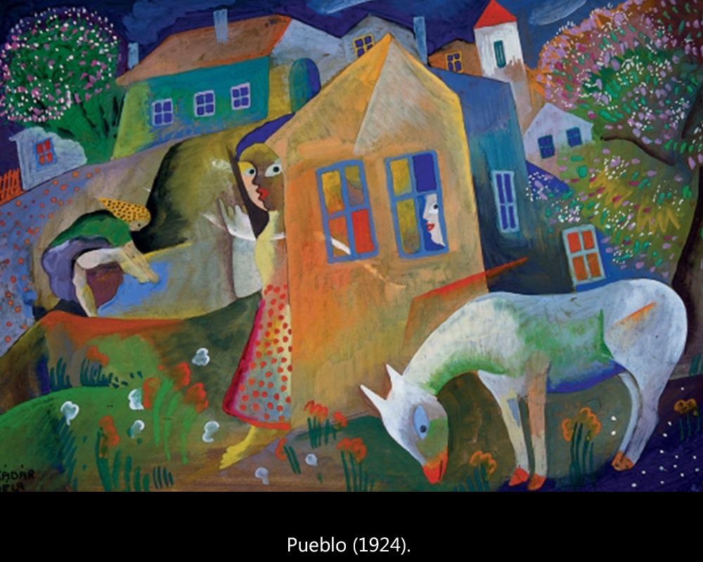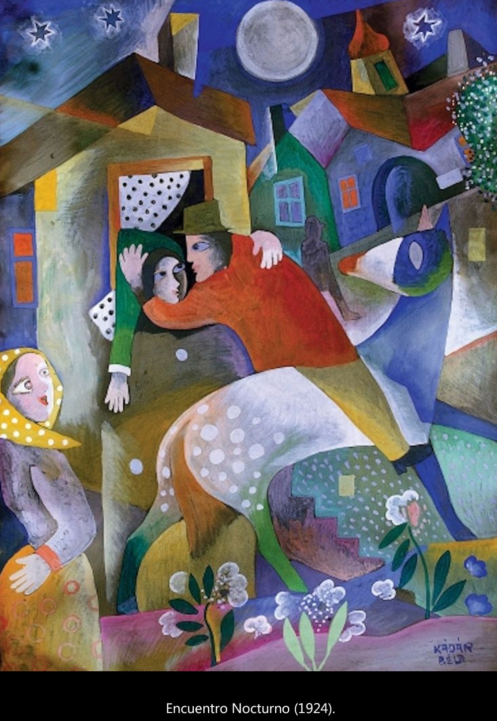 Kádár compartió estudio con Chagall en Berlín. Un hecho que no le quita mérito a la magia de sus obras, una magia que podríamos describir rápidamente como "chagalliana". Como muchos de los artistas de la efervescencia de la modernidad, está tan fascinado con el futuro como con el pasado, con su herencia cultural, con lo popular, lo primitivo: pinta campesinos, aldeas, recuerdos de una infancia feliz, idealizados, y usa para ello un colorido intenso y personal, mucha síntesis, ciertos toques de realismo mágico y algo de "ingenuidad".