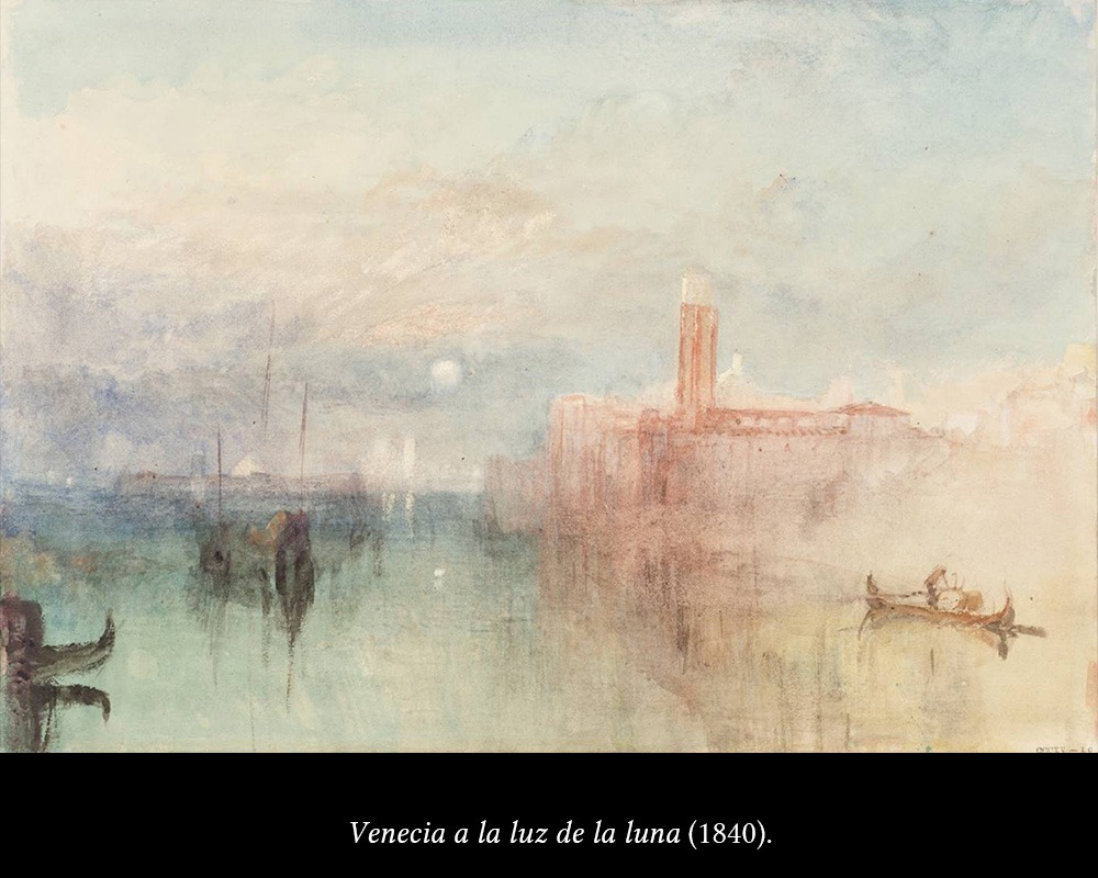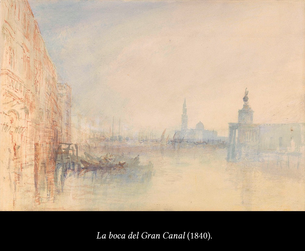 Turner es el gran pintor de atmósferas. Él mismo llega a decir: “La atmósfera es mi estilo”. Y cuando observamos sus vistas de Venecia, con su luz y sus reflejos únicos y cambiantes, de esa misma Venecia que luego deslumbrará y desafiará a los impresionistas, no nos quedan dudas de que su obra es un antecedente directo del impresionismo.