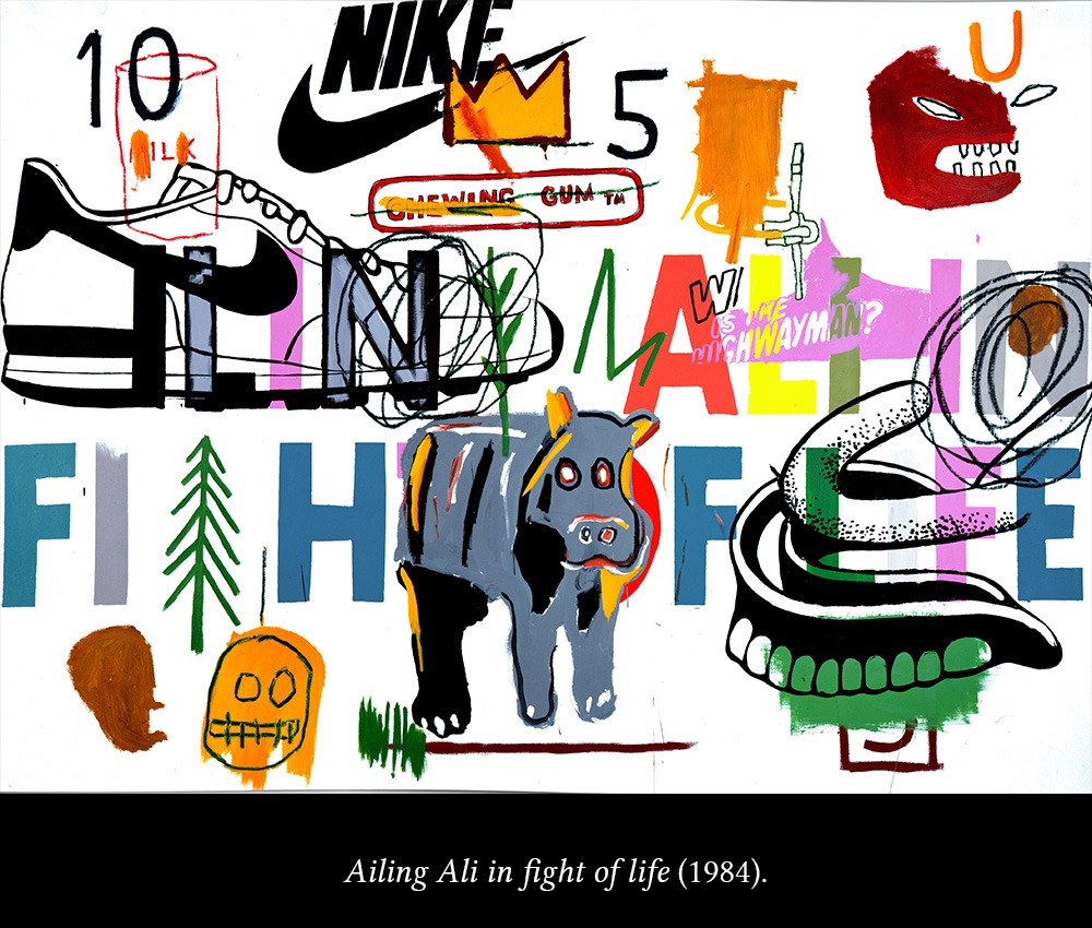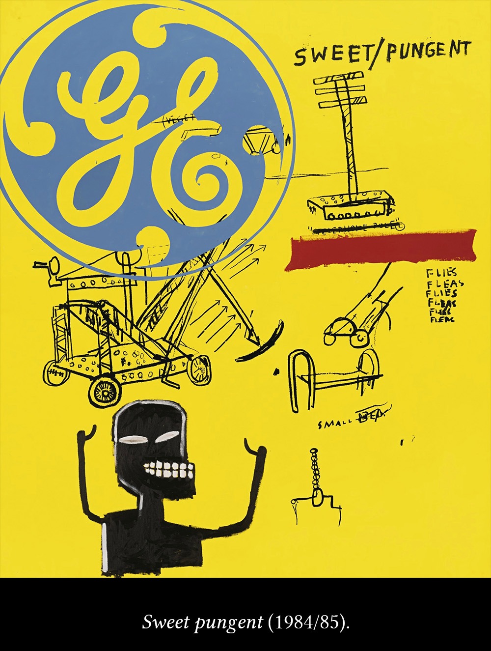 El lenguaje pop de Warhol (logotipos de marcas famosas, objetos de consumo masivo, precios), con el lenguaje graffitero, el dibujo instintivo, las palabras y las tachaduras. Un lenguaje más prolijo, más “pulcro”, y otro más caótico, más primitivo.