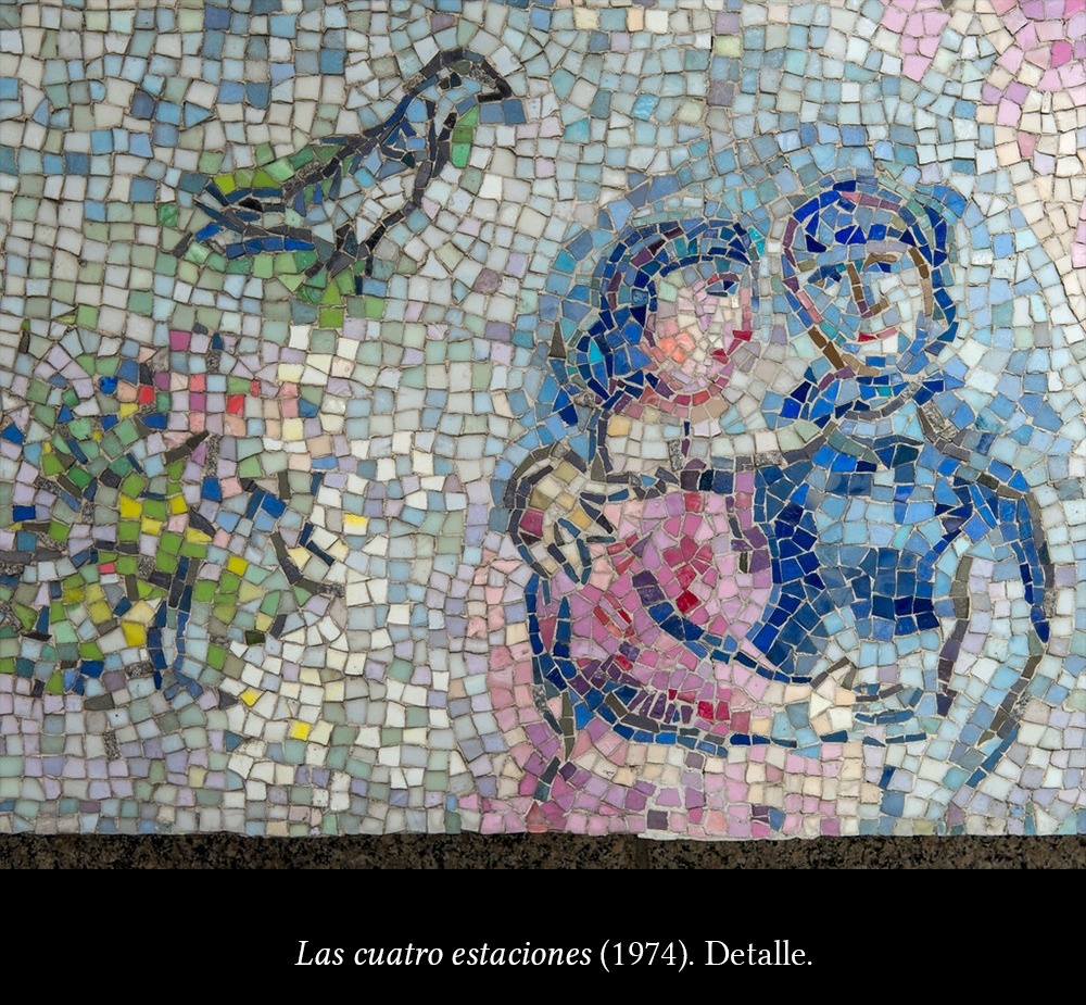 Esta obra de cuadros lados, monumental, que se encuentra en Chicago, la diseña en su estudio en Francia, luego la transfiere a esos enormes paneles y la instala con la ayuda de expertos en mosaicos. No faltan las parejas de amantes, peces, soles, flores y pájaros, que son los que solemos ver en sus cuadros. Pero ahora, el artista los recrea utilizando miles y miles de teselas (pequeños cerámicos con lo que se arma el mosaico), de más de 250 colores diferentes.