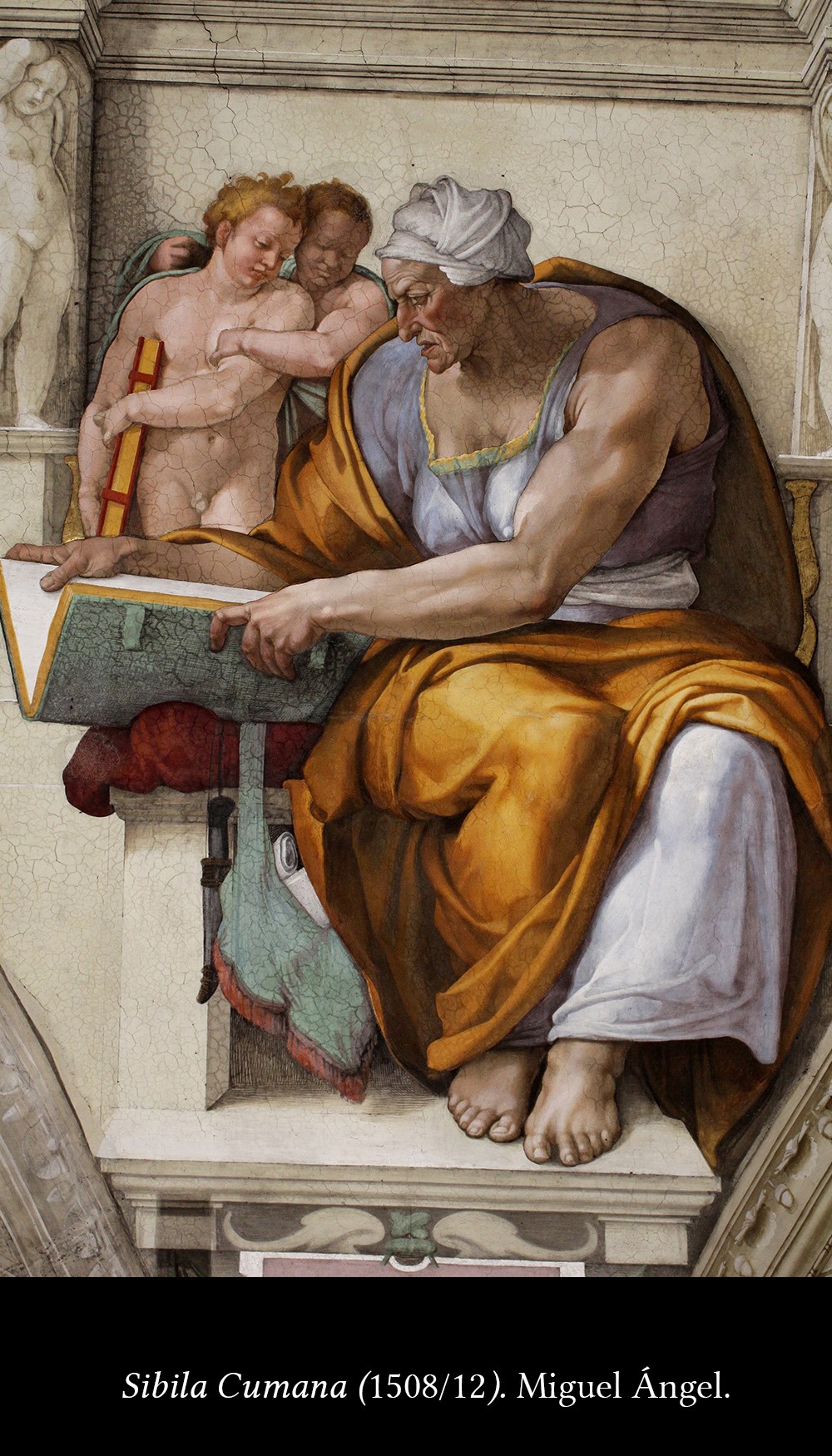 Las sibilas son personajes de las mitologías griega y romana. Su virtud es la de predecir el futuro: son sacerdotizas proféticas (por eso, las 5 sibilas de Miguel Ángel están intercaladas con 5 profetas). Y su nombre de “sibilas” proviene del mito de una joven profetisa que se llamaba Sibila. A partir de ella, se llamó así a cada mujer con el don de ver el futuro.