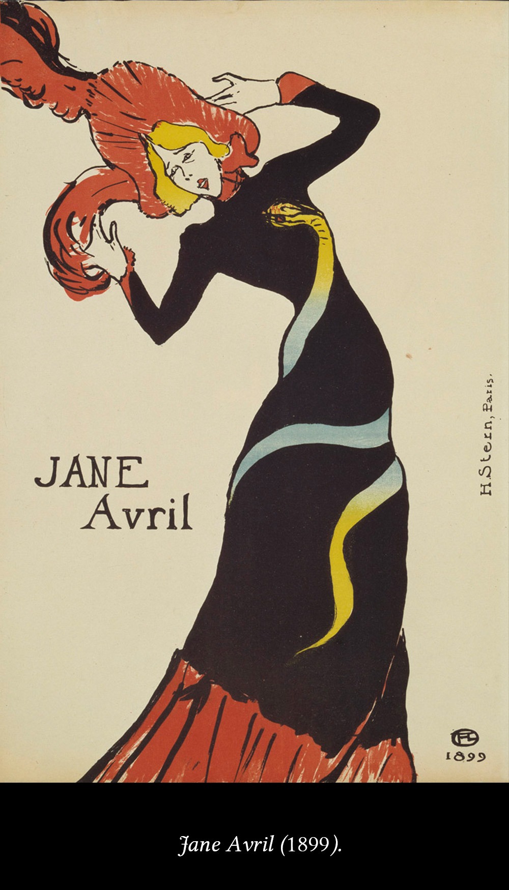 Con su elegancia, su gracia, su plasticidad y energía para la danza, encarna ella misma todo el espíritu de esa Belle Époque de desenfreno y celebración interminable. Y por eso mismo, justamente, es natural que la encontremos protagonizando varios cuadros y carteles de Toulouse-Lautrec, quien no sólo la admira sino que también es su amigo.