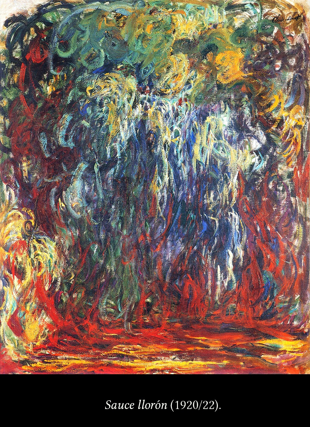 Al mismo tiempo, el artista amplía la escala, utiliza una paleta de colores más vivos, su pincelada se vuelve dramática, febril, intensifica la texturas (con la pincelada recargada de pintura) y va decididamente hacia la abstracción. Una abstracción donde notamos que a la "impresión" (a cómo percibe las cosas en un golpe de vista) le está agregando sentimiento, "expresión". Hay quienes sostienen que este cambio se debe exclusivamente a su problema con la vista, para otros el artista está tomando riesgos y ha decidido ir un poco más allá del impresionismo.