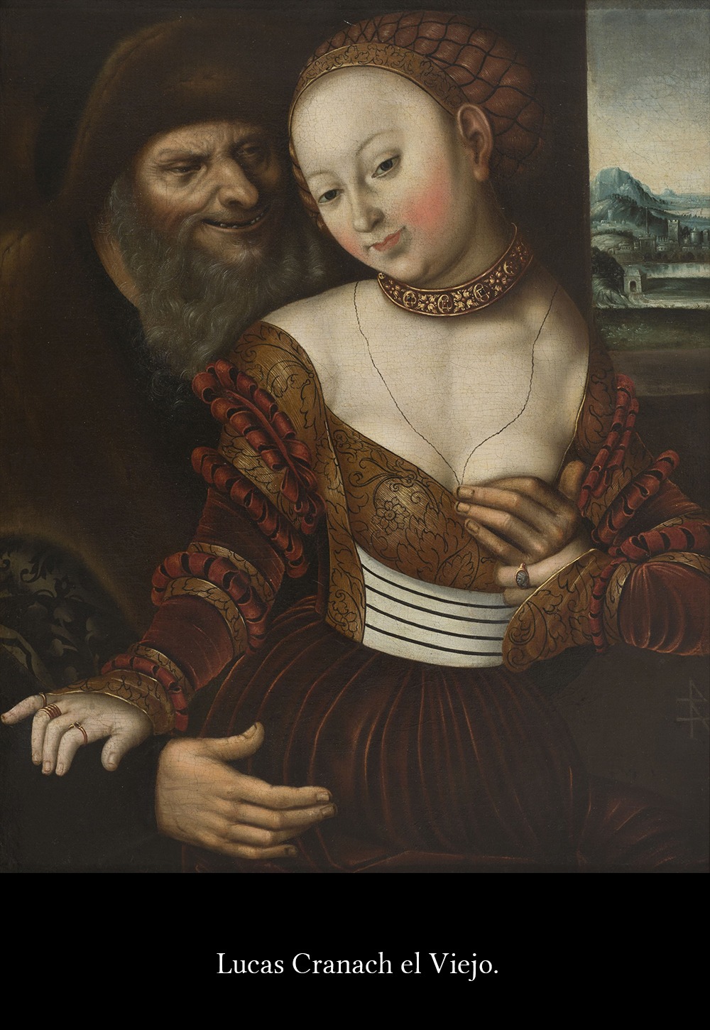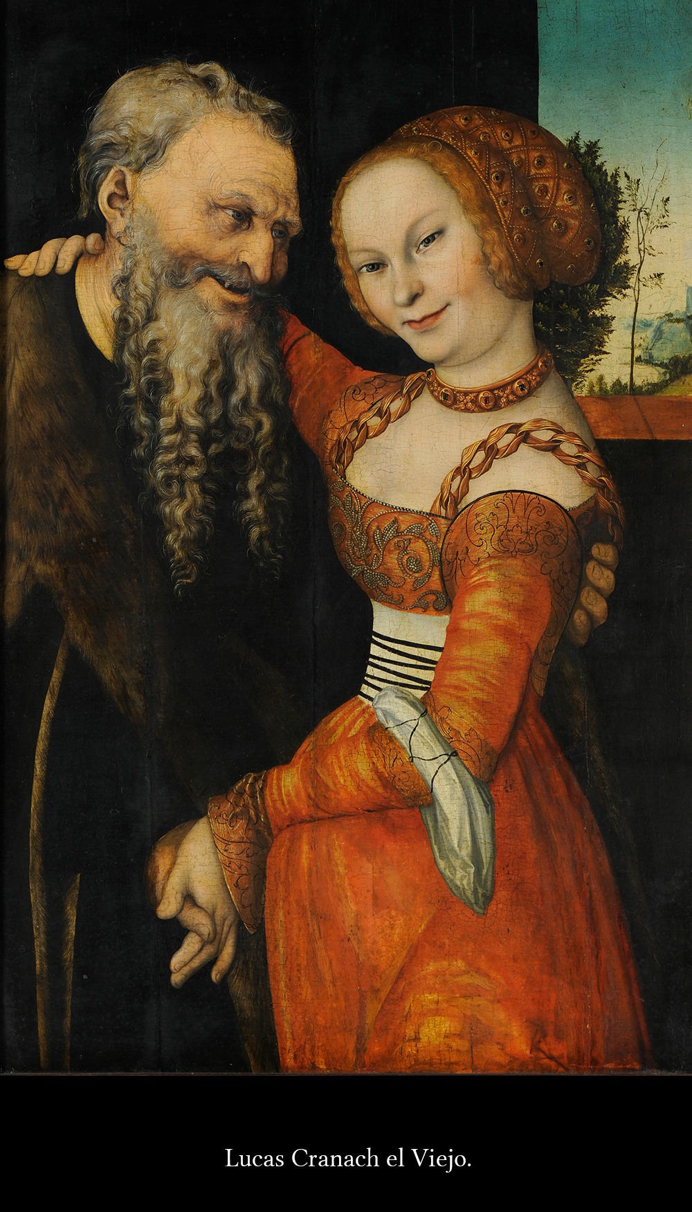 La serie de parejas desiguales de Lucas Cranach el Viejo (que empieza a pintar hacia 1517), donde vemos parejas de edades muy distintas unidas por la lujuria y la codicia, es un buen ejemplo de una diferencia clave entre el Renacimiento alemán (al que pertenece esta serie) y el italiano, en lo que hace a la representación de la figura humana y la belleza: mientras en Italia se buscan las proporciones armónicas e ideales, en Alemania el foco no está puesto en lo armónico sino en la expresividad, en la profundidad psicológica del personaje.