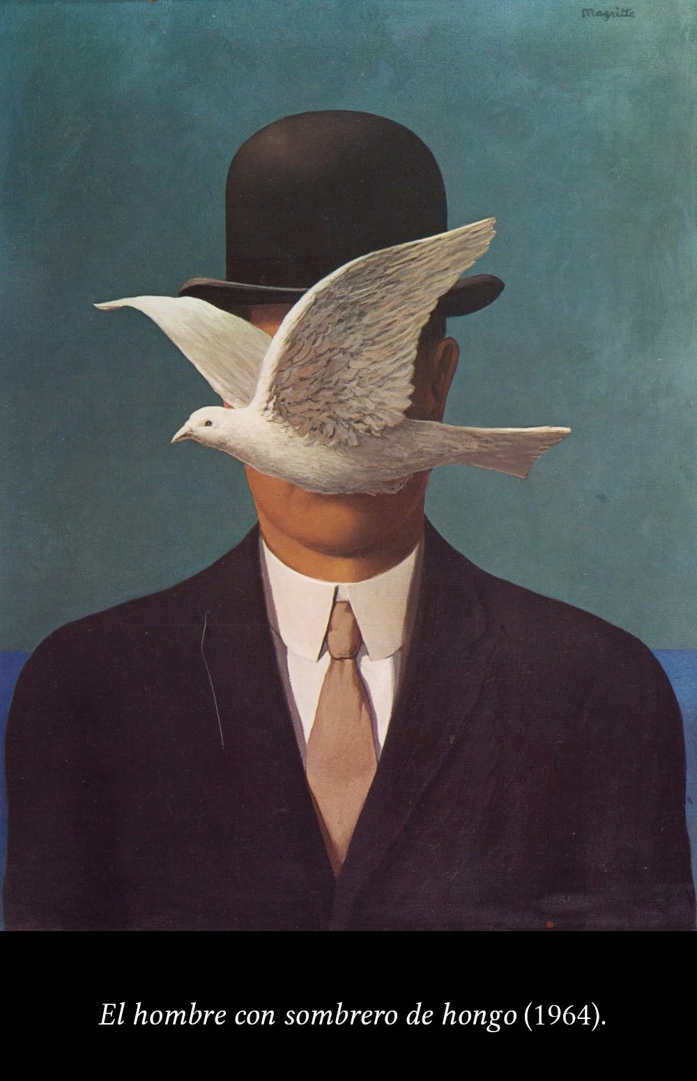 Con el bombín, Magritte convierte a cualquiera de sus personajes en el hombre común. No pinta personas en particular sino “al hombre”.