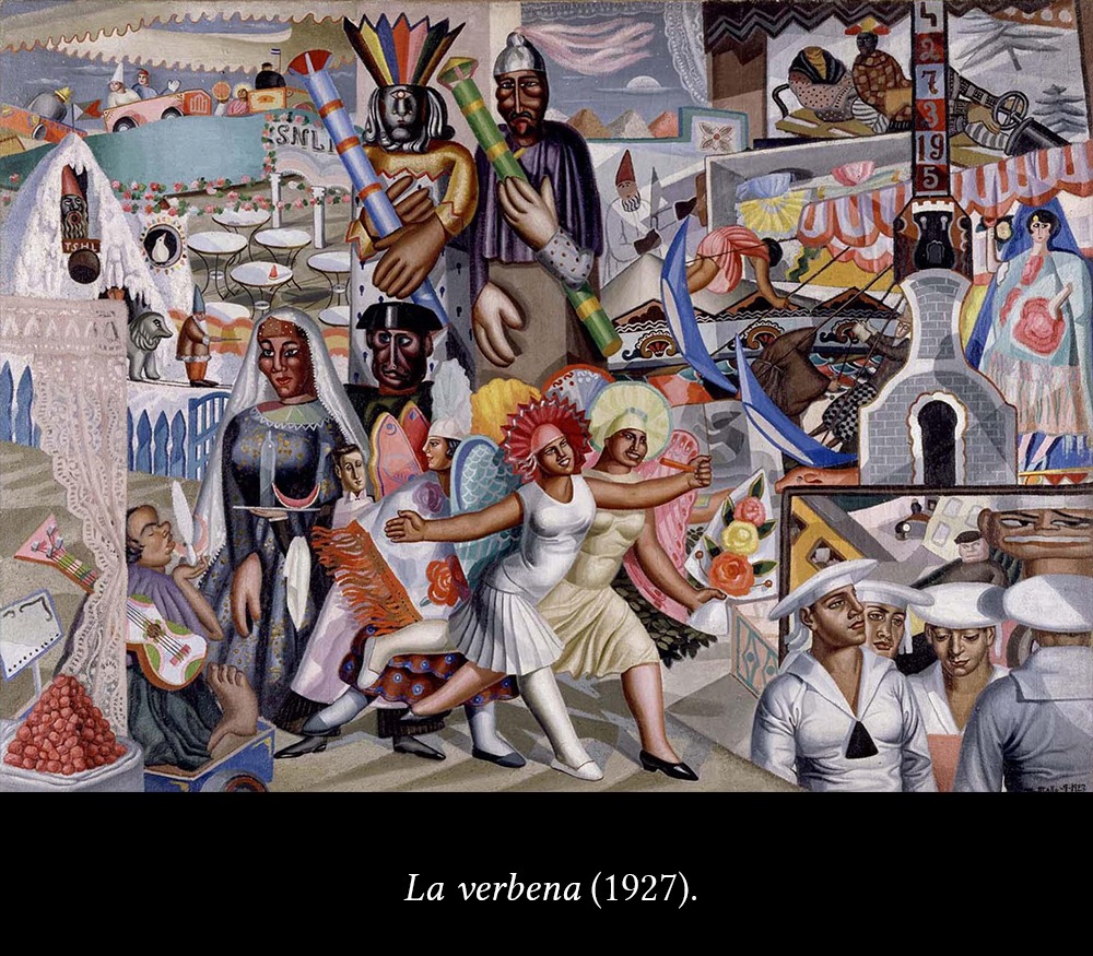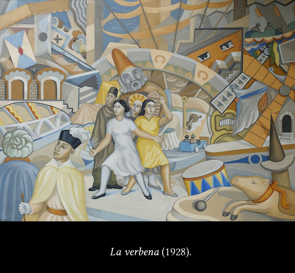 En una de las etapas de su carrera, Maruja Mallo pinta verbenas (fiestas populares de Madrid que se llaman así porque es tradición ir a ellas con un ramito de verbenas en la solapa).