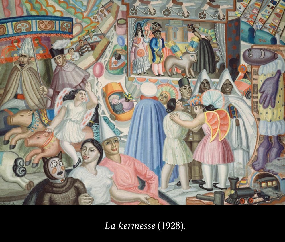 Son obras costumbristas. Pero que tienen lenguaje muy moderno de multiplicidad y superposición de escenas, en un aparente caos, que genera la sensación de movimiento, de energía vital. Un recurso muy bien elegido para transmitir perfectamente el clima festivo, la alegría, el bullicio (un recurso que nos remite, aunque de manera un poco más figurativa -algo “figurativo” es cuando podemos identificar claramente el objeto o la persona representada-, al vibracionismo, ese estilo que transmite “la vibración universal”).