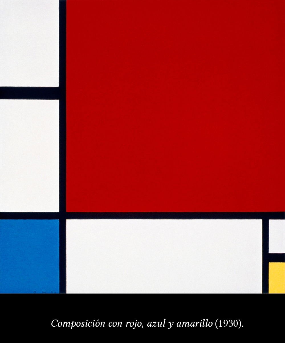 Planos geométricos con los colores primarios más el blanco y el negro. Elementos esenciales, lo más elemental, para ir en busca de la belleza “pura”, la armonía “pura” (pensemos que son los comienzos de la abstracción total, cuando por primera vez lo que se pinta no es una representación de algo que está afuera del cuadro).