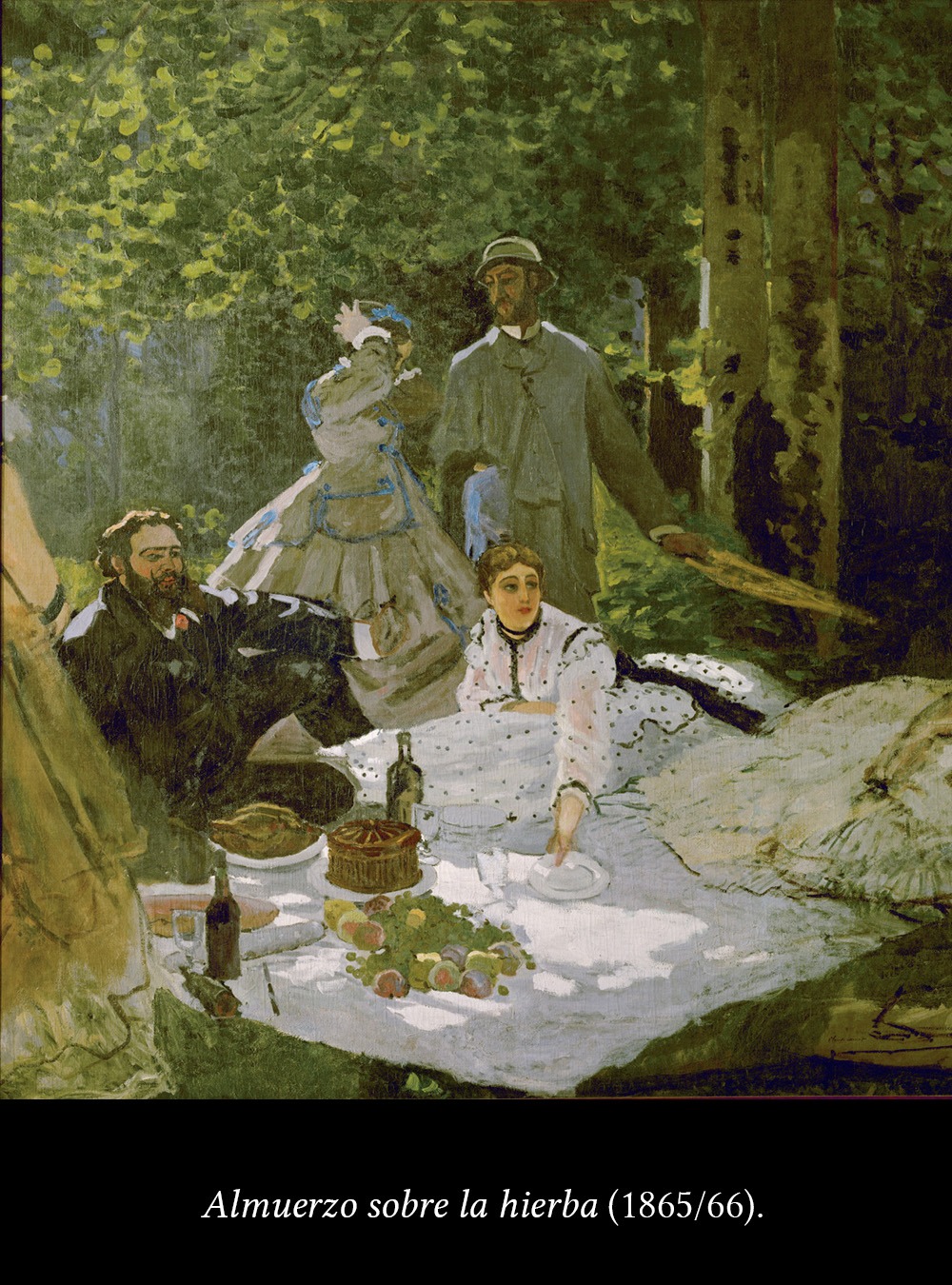 Podemos observar su intención de captar “lo real” en vez de pintar lo que imponen las academias. Entonces vamos a encontrar también su admiración por Manet, especialmente la admiración por el Almuerzo sobre la hierba (es la obra de Manet que motiva a los que se convertirán en impresionistas a profundizar esa búsqueda de lo real, y de la cual Monet pinta su propia versión).
