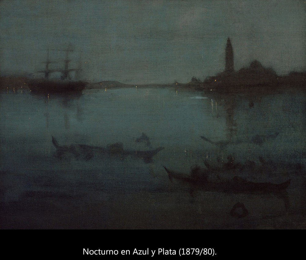 Whistler, en la segunda mitad del siglo XIX (cuando aún las vanguardias del siglo XX no han llegado, evidentemente), basa sus composiciones en las armonías de color como si fueran armonías musicales (algo que luego harán, por ejemplo, Kandinsky, Marc, Delaunay y muchos otros pintores abstractos al inicio de la abstracción total). Y para dejar bien claras sus intenciones, les pone entonces a sus cuadros nombres provenientes de la música, como “armonía”, "sinfonía, “arreglo” o “nocturno”.